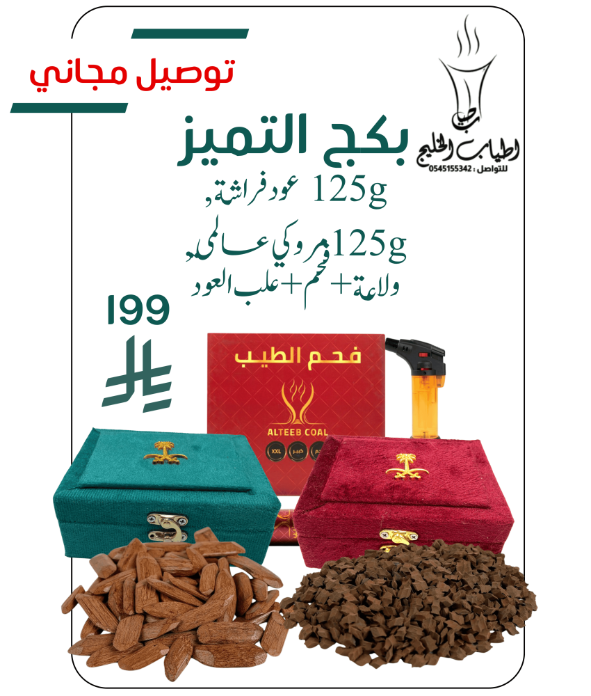 بكج التميز من اطياب الخليجافخر انواع العود مع هدايا خاصة125g عود فراشة125g مروكي عالميفحم فاخرولاعةعلب العود الفاخرة